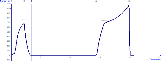 硬度(Hardness): 第一個峰的力值,代表輕壓時樣品的抗壓力,g。 屈服強度(Yield Strength): 樣品第二個峰的拐點或破裂點的力值,g。 屈服距離(Yield Point): 樣品第二個峰的拐點或破裂點對應的位移距離,mm。 彈性(Springiness): 兩次壓縮的樣品高度比值。 回復性(Resilience): 第一次壓縮的壓縮能量與回復能量比值。 脆度(Fragility): 第二次破壞性壓縮時的峰個數,代表樣品發生破裂的次數。 | ||