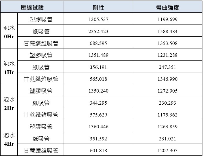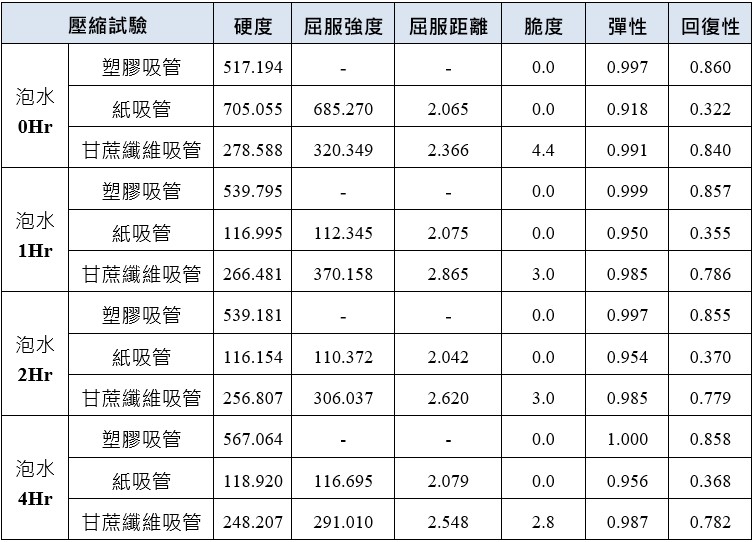 目的 | 透過物性分析儀的搭配三點彎曲裝置與直徑36mm柱型探頭,測試不同材質的吸管泡水不同時間後的質地特徵。 | |