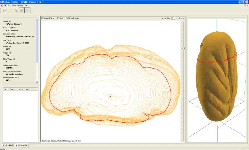 将样品安装在仪器两端,通过仪器来记录样品的重量与形状。测量时会自动对样品进行称重,在转动时通过激光按固定时间间隔来测定样品的外形轮廓。完成检测后,样品的体积、长度、最大宽度、最大高度、最大宽度的高度以及最大高度的宽度等测量结果将自动显示呈现并记录保存。数据可通过二维视图或三维视图进行查看,从而可与从前保存的结果进行比较。资料在保存后可以进行排序例如通过批次、日期等条件。通过这个排序标准可以将平均值、标准偏差、变异系数进行分组并计算。 在快速发展的烘焙行业中,快速的产品测量以及提供自动计算的质量控制合格或不合格基准是制造智能和成功的关键。 对于那些希望验证其成品斜切三明治是否适合所选包装的三明治面包的制造商,透过最大高度和宽度的确定将使他们的适合性完整呈现;对于法式面包和面包卷的制造商,可以进一步的计算“最小覆盖圆”,以测量容纳产品而不变形的最小包装直径,包含最大扫描切片的所有数据点的最小圆。 软件不断地发展,还增加了表面积的测量,如果需要,也可以自定义其他参数和计算,并提供了将计算和数据引用添加到Volscan软件中的选项,以优化您希望包含在报告中的信息。 |