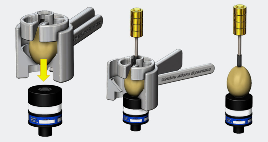样品通过加重轴的支撑和用户可更换的微型胶点固定在适当的位置。根据要支持的样品,套件中包含支持解决方案(瓶盖)的选择。选择的盖子安装在轴的末端,轴上固定有一个 50 克的重物。根据所需的支撑,提供额外的 50g 和 3 x 50g 砝码作为选项。 为了以完美的垂直对齐方式安装禽蛋,我们还开发了一种设备,该设备可以容纳不同大小的禽蛋(从鹌鹑到鹅)并将样品呈现在支架上。如果形状和尺寸测量的准确性很重要,那么这是必要的,因为未对准的样品会导致结果受影响。 |